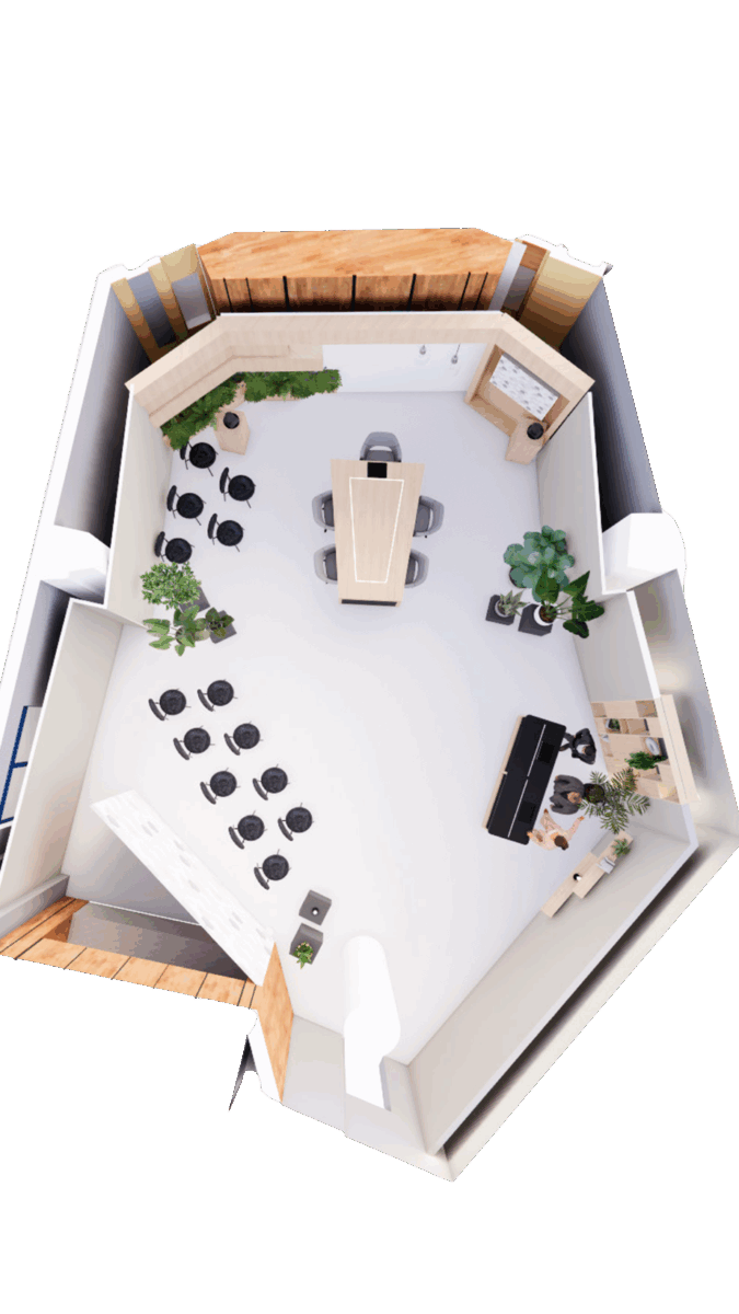Het stijlvolle en flexibele decor biedt volop ruimte voor eigen branding, zodat de setting altijd perfect aansluit bij jouw boodschap. Bovendien is er plaats voor ruim 20 personen livepubliek.